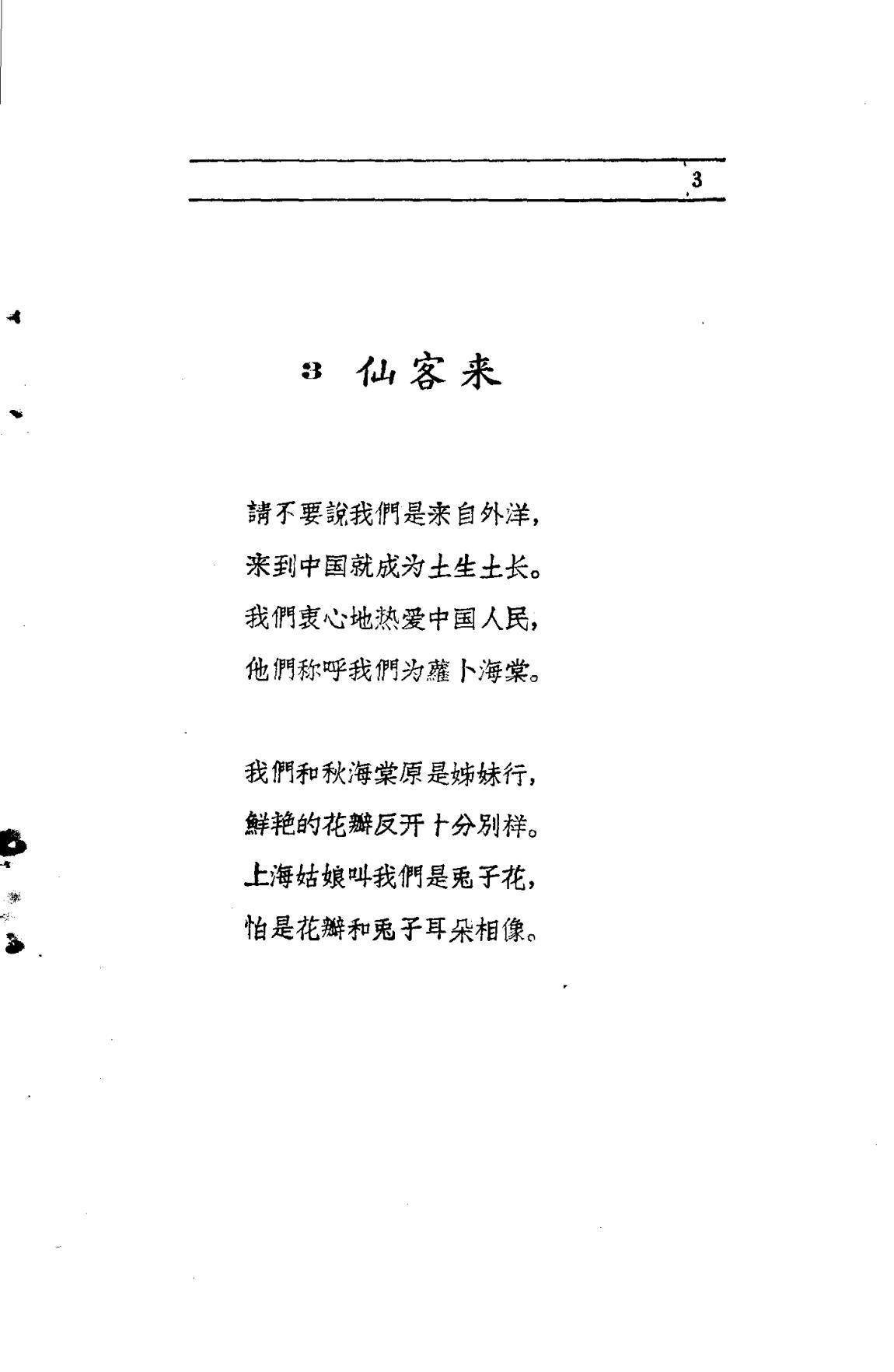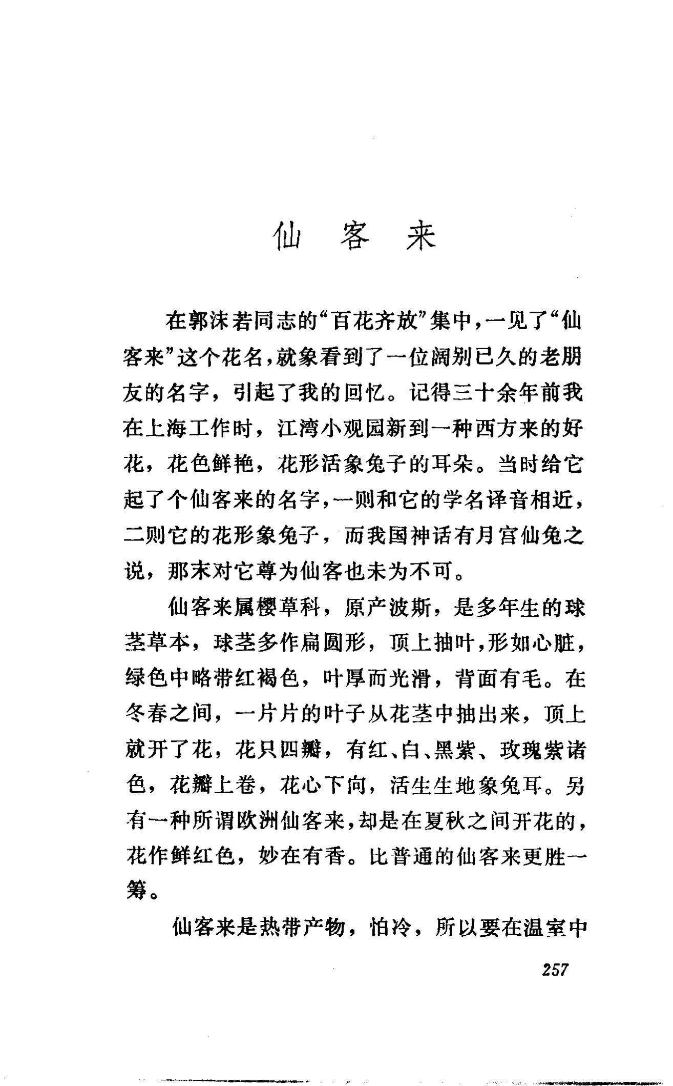 1958年郭沫若的诗集《百花齐放》出版,其中第三首是《仙客来》:“请不要说我们是来自外洋,来到中国就成为土生土长。我们衷心地热爱中国人民,他们称呼我们为萝卜海棠。我们和秋海棠原是姊妹行,鲜艳的花瓣反开十分别样。上海姑娘叫我们是兔子花,怕是花瓣和兔子耳朵相像。”