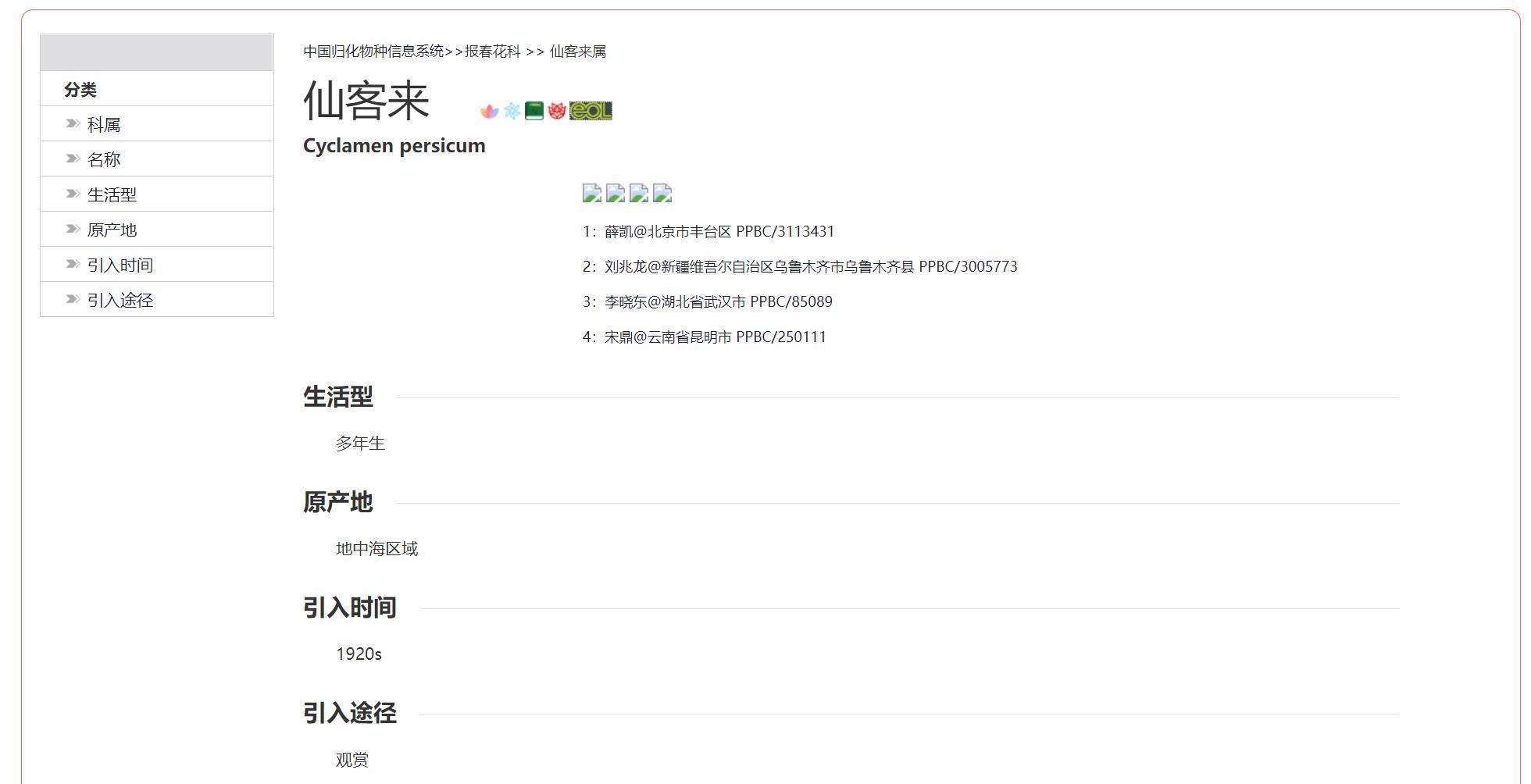 植物智的“中国归化物种信息系统”说,仙客来引入中国的时间是1920s,看来这个引进时间是比较准确的了。